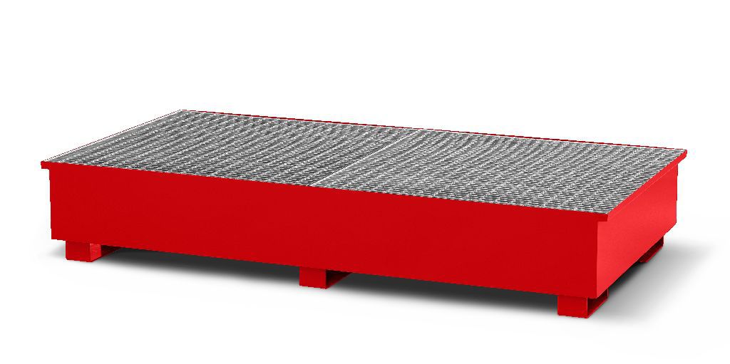 Auffangwanne aus Stahl für 2x 1000 Liter IBC, BxTxH 2.560 x 1.300 x 450 mm, Übereinstimmungserklärung gemäß StaWa-R, RAL 3000 feuerrot